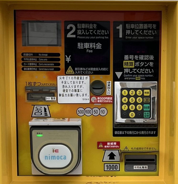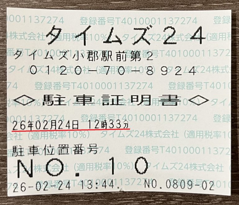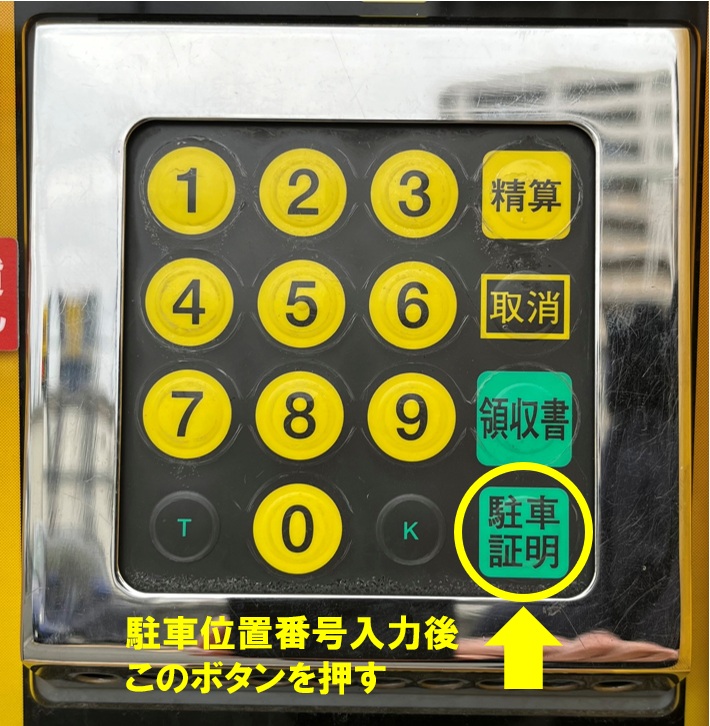 ① 精算機で駐車位置番号を入力し、「駐車証明」ボタンを押す。